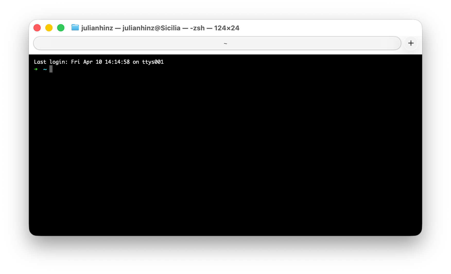 julianhinz— your usernameMacBook-Pro— the computer name~— your current directory (~is shorthand for your home folder)%— “ready for your input” (the character varies:$on bash,%on zsh)