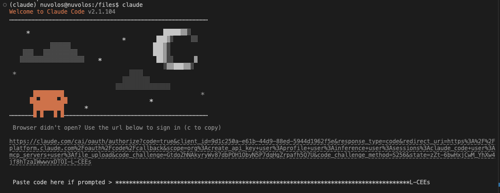 Make sure you ran npm install -g @anthropic-ai/claude-code@2.1.104 in Step 3. The default version installed on Nuvolos uses a different authentication flow that doesn’t support pasting codes.